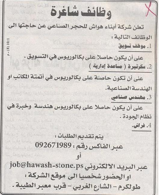 شركة انباء هواش للحجر الصناعي: وظائف شاغرة