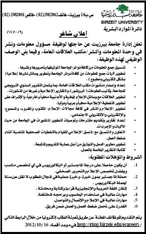 جامعة بيرزيت: مسؤول معلومات ونشر