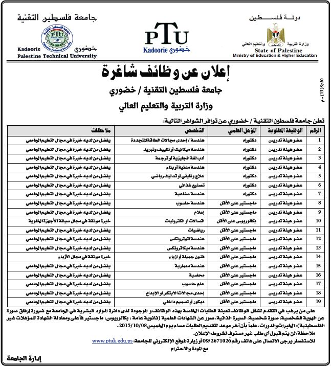 جامعة فلسطين التقنية/ خضوري: وظائف شاغرة