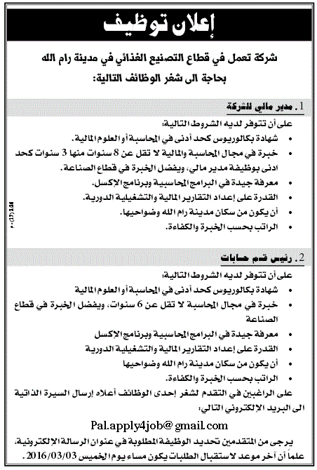 شركة تعمل في قطاع التصنيع الغذائي : اعلان توظيف