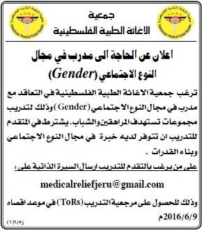 الاغاثة الطبية الفلسطنية : مدرب في مجال النوع الاجتماعي