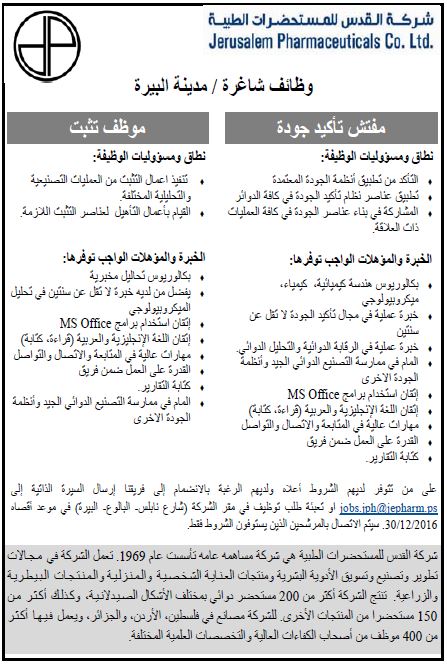 شركة القدس للمستحضرات الطبية: وظائف شاغرة - البيرة