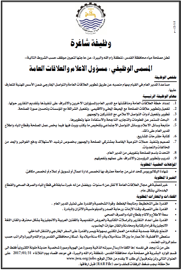 مصلحة مياه محافظة القدس: مسؤول الاعلام والعلاقات العامة