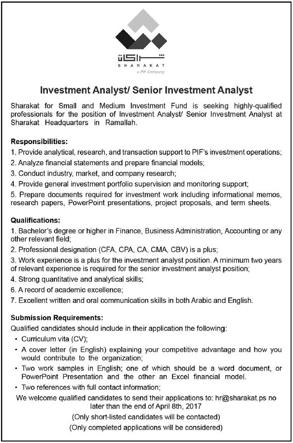 Sharakat: Investment Analyst/ Senior Investment Analyst