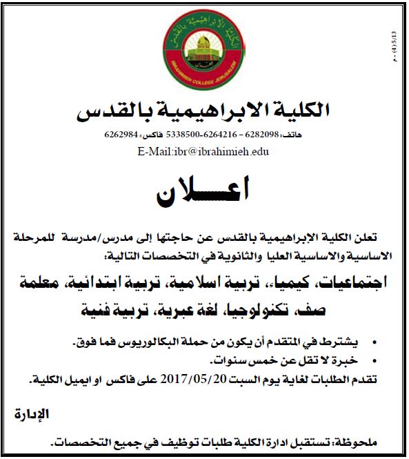 الكلية الابراهيمية بالقدس: مدرس/ة لعدة تخصصات ومراحل
