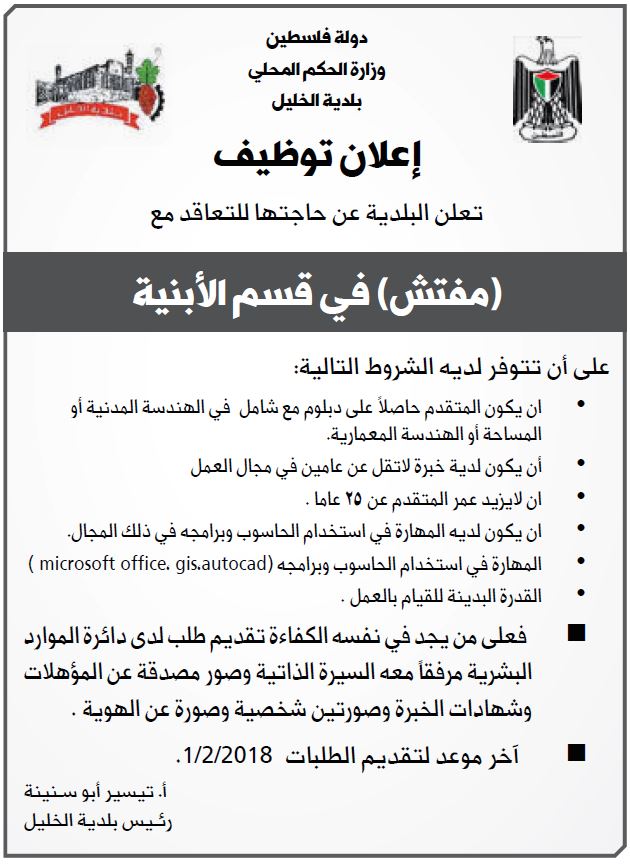 بلدية الخليل: مفتش في قسم الأبنية