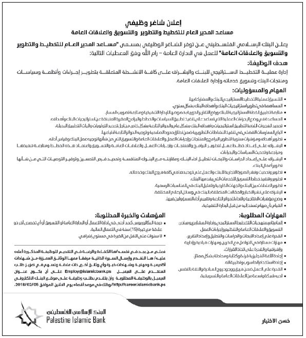 البنك الاسلامي الفلسطيني: مساعد المدير العام للتخطيط والتطوير والتسويق والعلاقات العامة