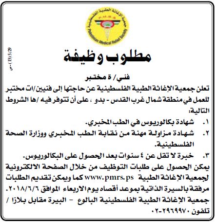 جمعية الاغاثة الطبية الفلسطينية: فني/ة مختبر