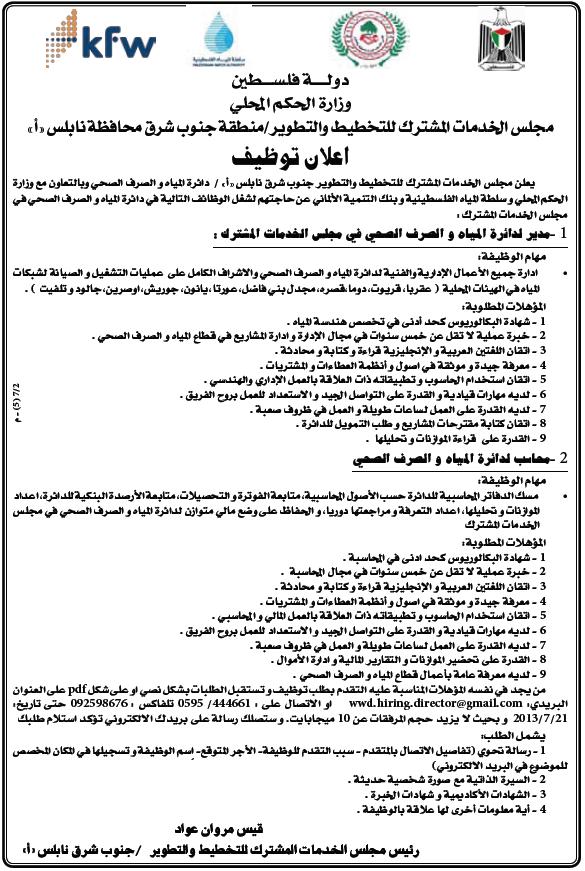 مجلس الخدمات المشترك/ جنوب شرق محافظة نابلس: وظائف شاغرة