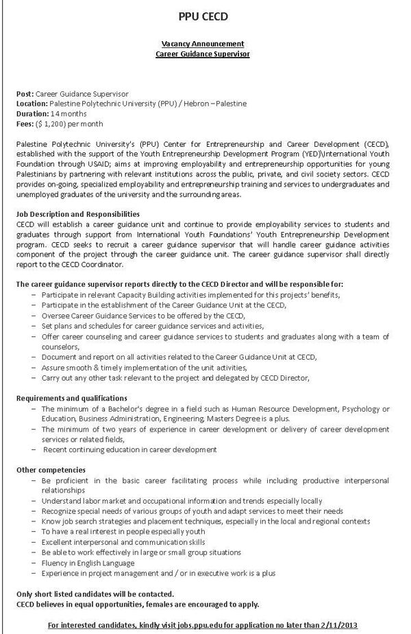 Palestine Polytechnic Universitu: Career Guidance Supervisor - hebron