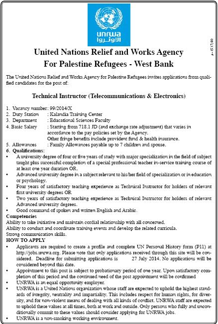 UNRWA: Technical Instructor -Telecommunications & Electronics