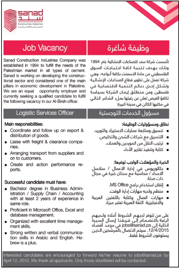 شركة سند للصناعات الانشائية: مسؤول الخدمات اللوجستية