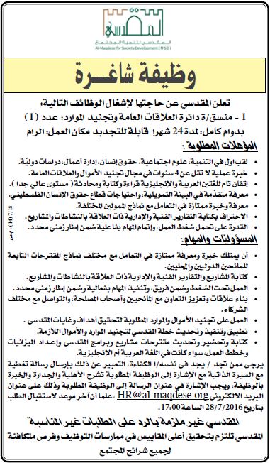 المقدسي لتنمية المجتمع: وظائف شاغرة