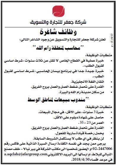 شركة جعفر للتجارة والتسويق: محاسب لمنطقة رام الله