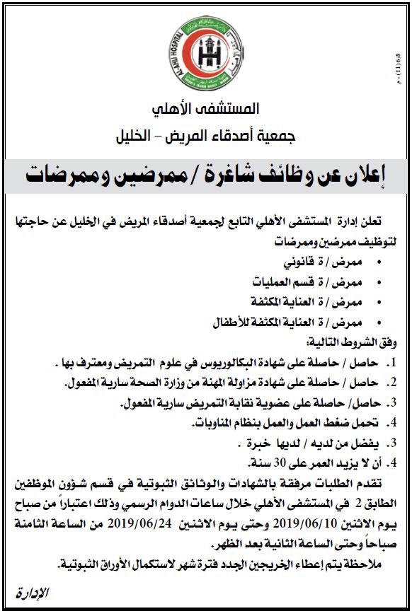 المستشفى الأهلي: ممرضين وممرضات - الخليل