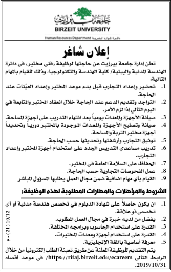 جامعة بير زيت: فني مختبر